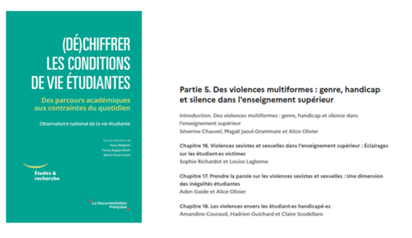 Gaide Aden et Olivier Alice, 2025, "Prendre la parole sur les violences sexistes et sexuelles : une dimension des inégalités étudiantes", in Belghith Feres, Bugeja-Bloch Fanny et Couto Marie-Paule (dir.), (Dé)chiffrer les conditions de vie étudiantes. Des parcours académiques aux contraintes du quotidien, Paris, La Documentation française, pp. 255-266.