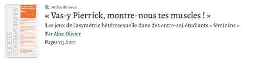 Olivier, A. (2025). « Vas-y Pierrick, montre-nous tes muscles ! » Les jeux de l’asymétrie hétérosexuelle dans des entre-soi étudiants « féminins » Sociétés contemporaines, 137-138(1), 173-201.