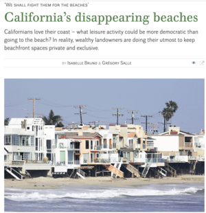 Avec Grégory Salle, « Californie, la guerre des plages n’aura plus lieu», Le Monde diplomatique, août 2024, p. 11 (traduit en allemand : "Das Recht auf Strand in Kalifornien"; en anglais : "California’s disappearing beaches"; en espagnol : "En California: playas en conflicto"; en portugais : "A guerra das praias na Califórnia já não terá lugar").