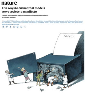 A. Saltelli, G. Bammer, I. Bruno, E. Charters, M. Di Fiore, W. N. Espeland, J. Kay, S. Lo Piano, D. Mayo, R. Pielke Jr., T. Portaluri, T. M. Porter, A. Puy, I. Rafols, J. R. Ravetz, E. Reinert, D. Sarewitz, P. B. Stark, A. Stirling, J. van der Sluijs, P. Vineis, « Five ways to ensure that models serve society : a manifesto », Nature, vol. 582, 25 June 2020, p. 482-484.