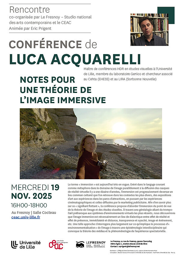 La conférence propose d'aborder l'immersion du point de vue de la théorie de l'image et des études visuelles. À travers une généalogie allant du trompel'œil prébaroque aux systèmes d'environnements virtuels les plus récents, nous découvrirons que l'image immersive est nécessairement un lieu de dialectique entre effet de réalité et effet de présence, immédiateté et distance, transparence et opacité, image et événement, etc. Une telle approche s'interrogera plus largement sur ce qu'implique le processus d'« environnementalisation » de l'image à travers une épistémologie interdisciplinaire qui convoque la théorie des médias et la phénoménologie de l'expérience spectatorielle.